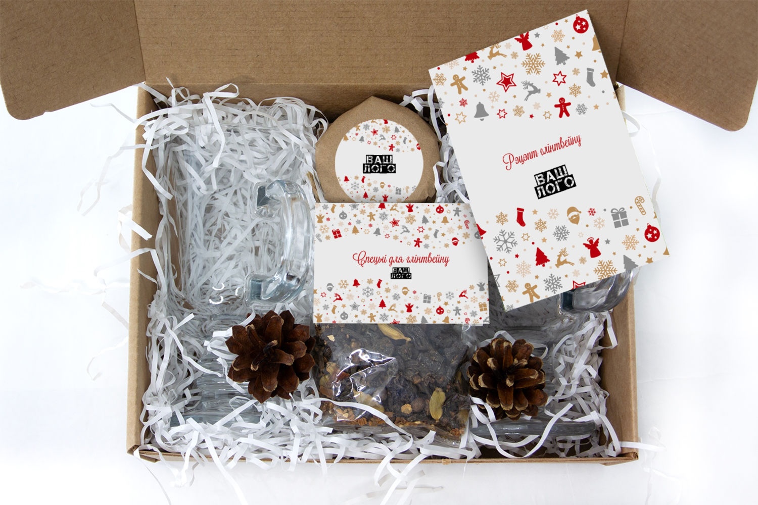 Наборы с глинтвейном - актуальны для новогодних корпоративных подарков. А готовые варианты дизайна оформления позволят подобрать вариант под корпоративный стиль вашей компании. Ваш логотип будет размещен на наклейке к коробке, бирке к специям для глинтвейна, на наклейке меда, на рецепте приготовления