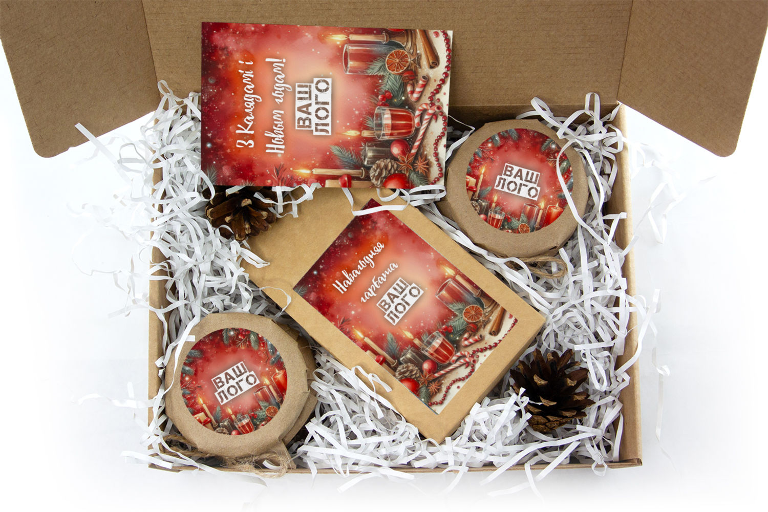 в крафт-коробке с наклейкой. Наклейка 6*9,5см с вашим логотипом