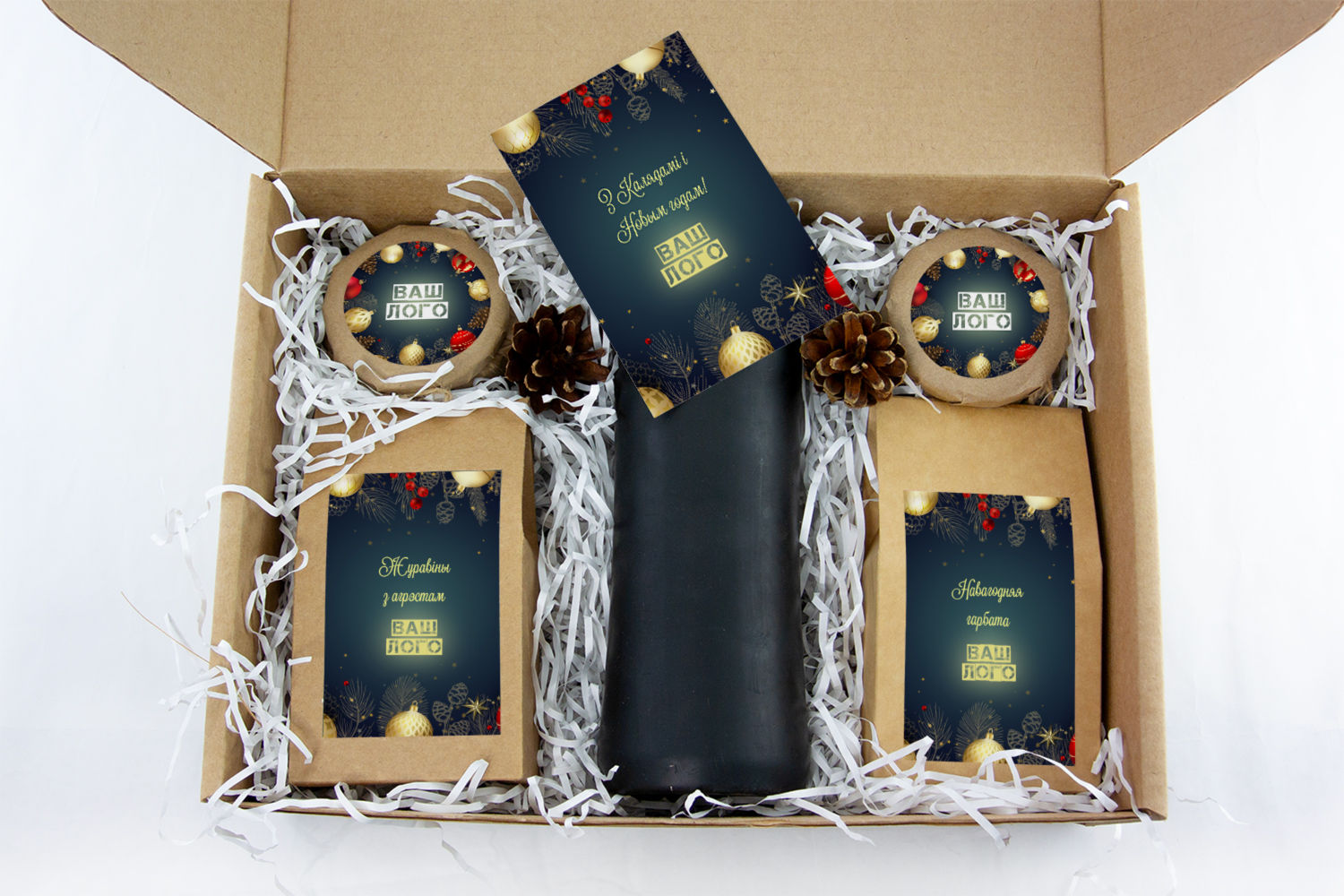 в крафт-коробке с наклейкой. Наклейка 6*9,5см с вашим логотипом