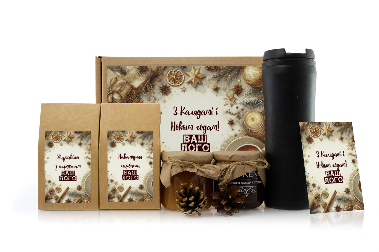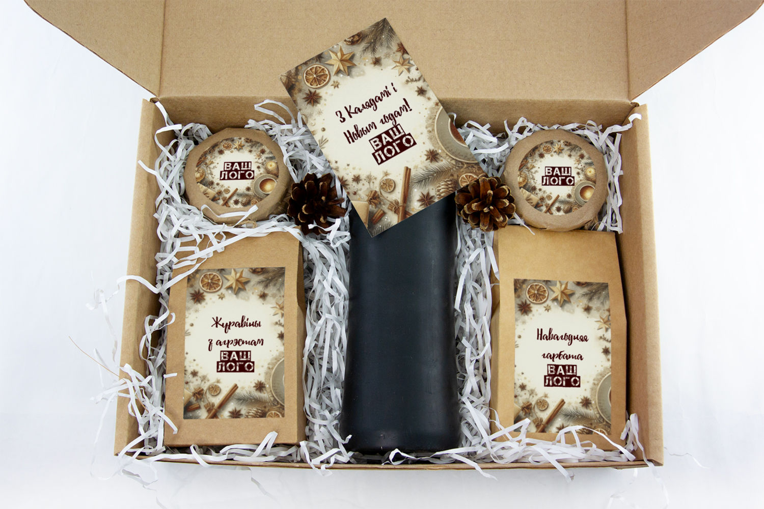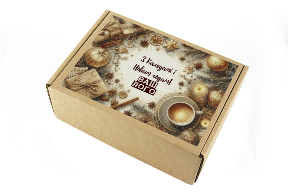 в крафт-коробке с наклейкой. Наклейка 6*9,5см с вашим логотипом
