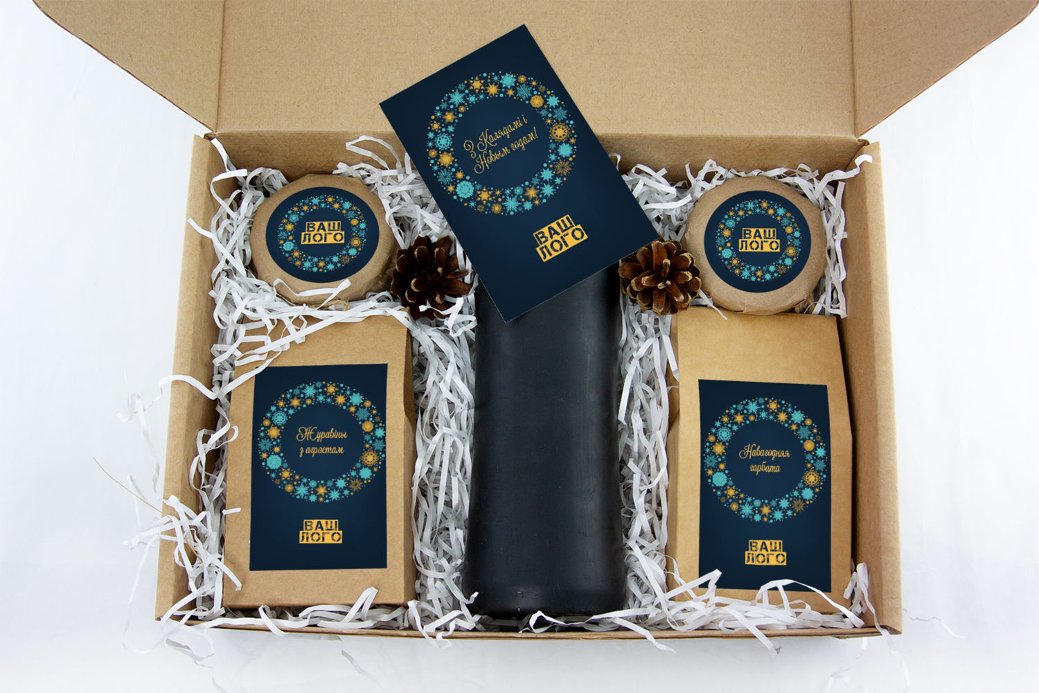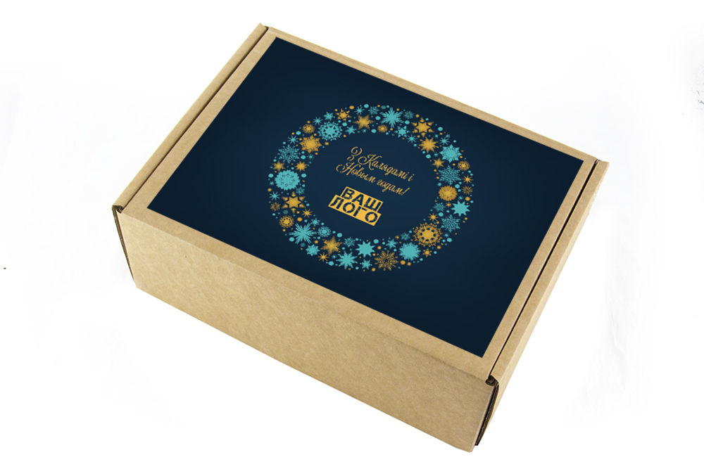 в крафт-коробке с наклейкой. Наклейка 6*9,5см с вашим логотипом