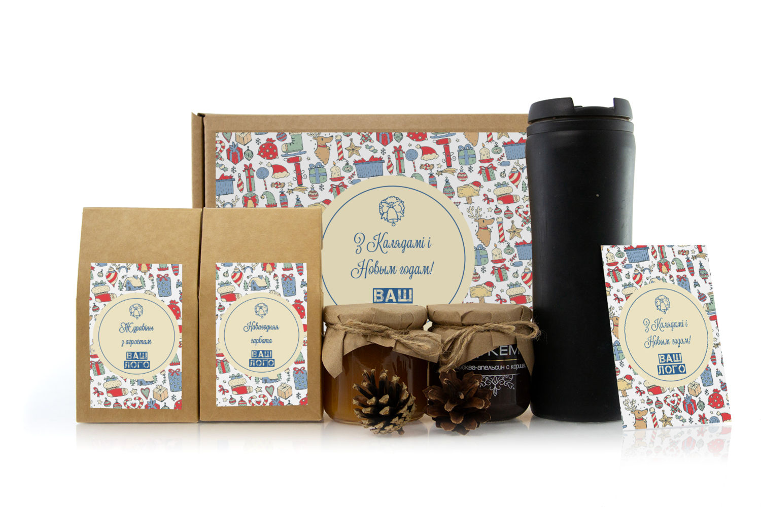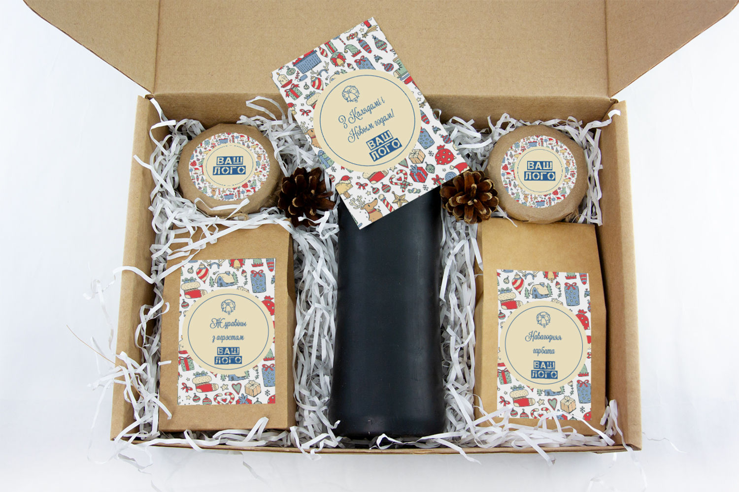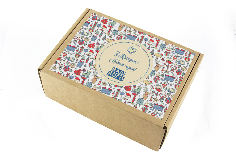 в крафт-коробке с наклейкой. Наклейка 6*9,5см с вашим логотипом