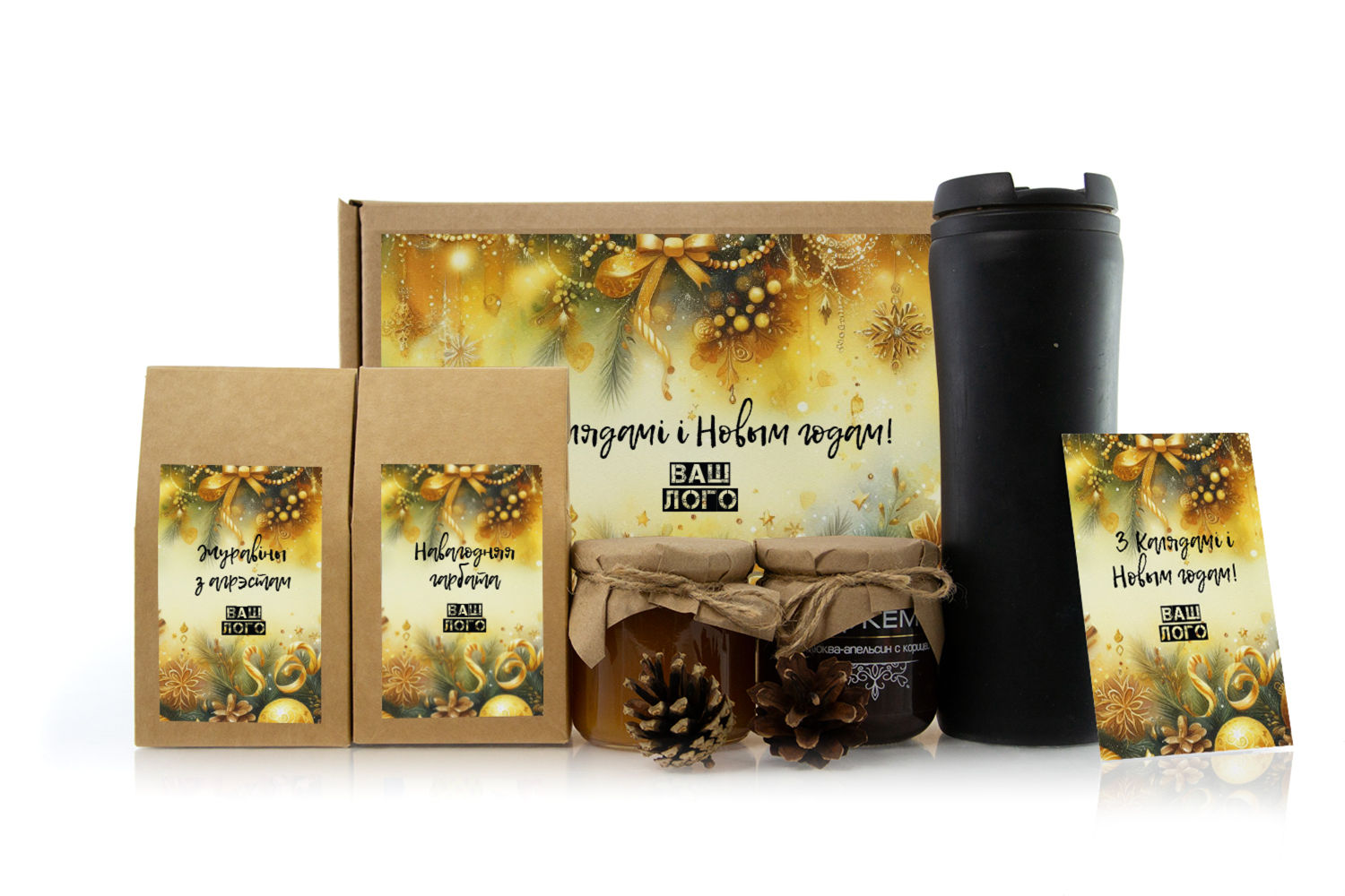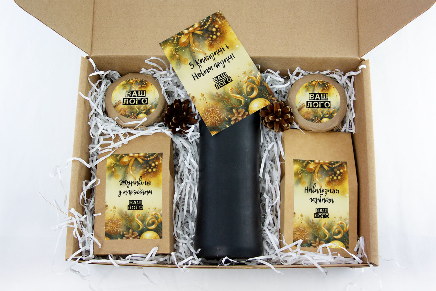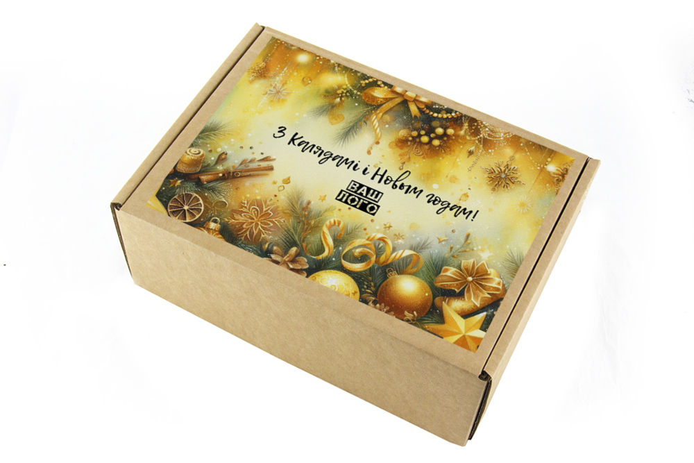 в крафт-коробке с наклейкой. Наклейка 6*9,5см с вашим логотипом