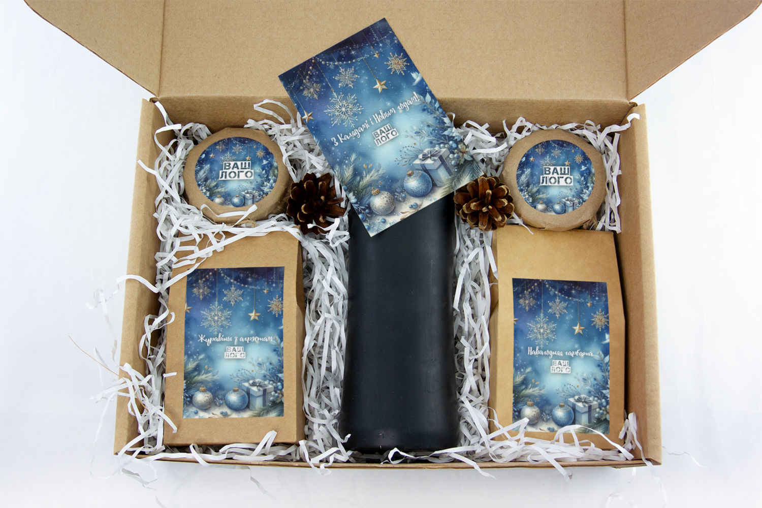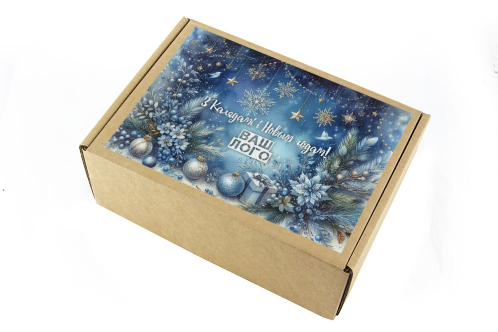 в крафт-коробке с наклейкой. Наклейка 6*9,5см с вашим логотипом