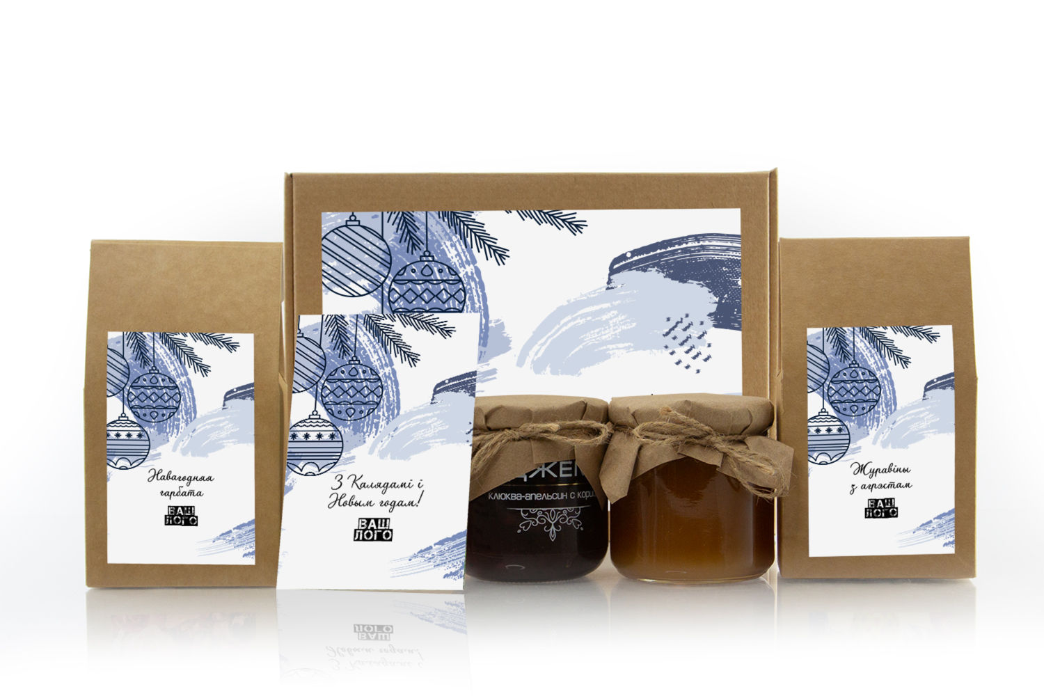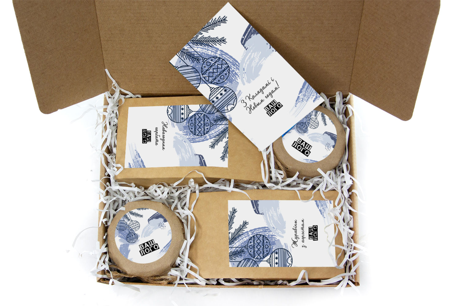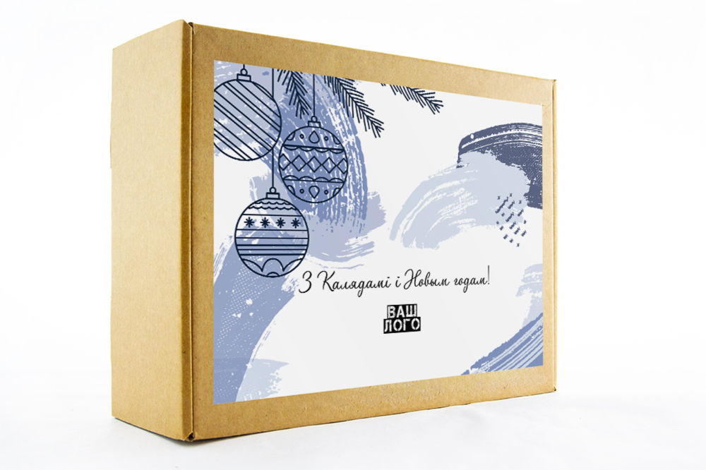в крафт-коробке с наклейкой. Наклейка 6*9,5см с вашим логотипом