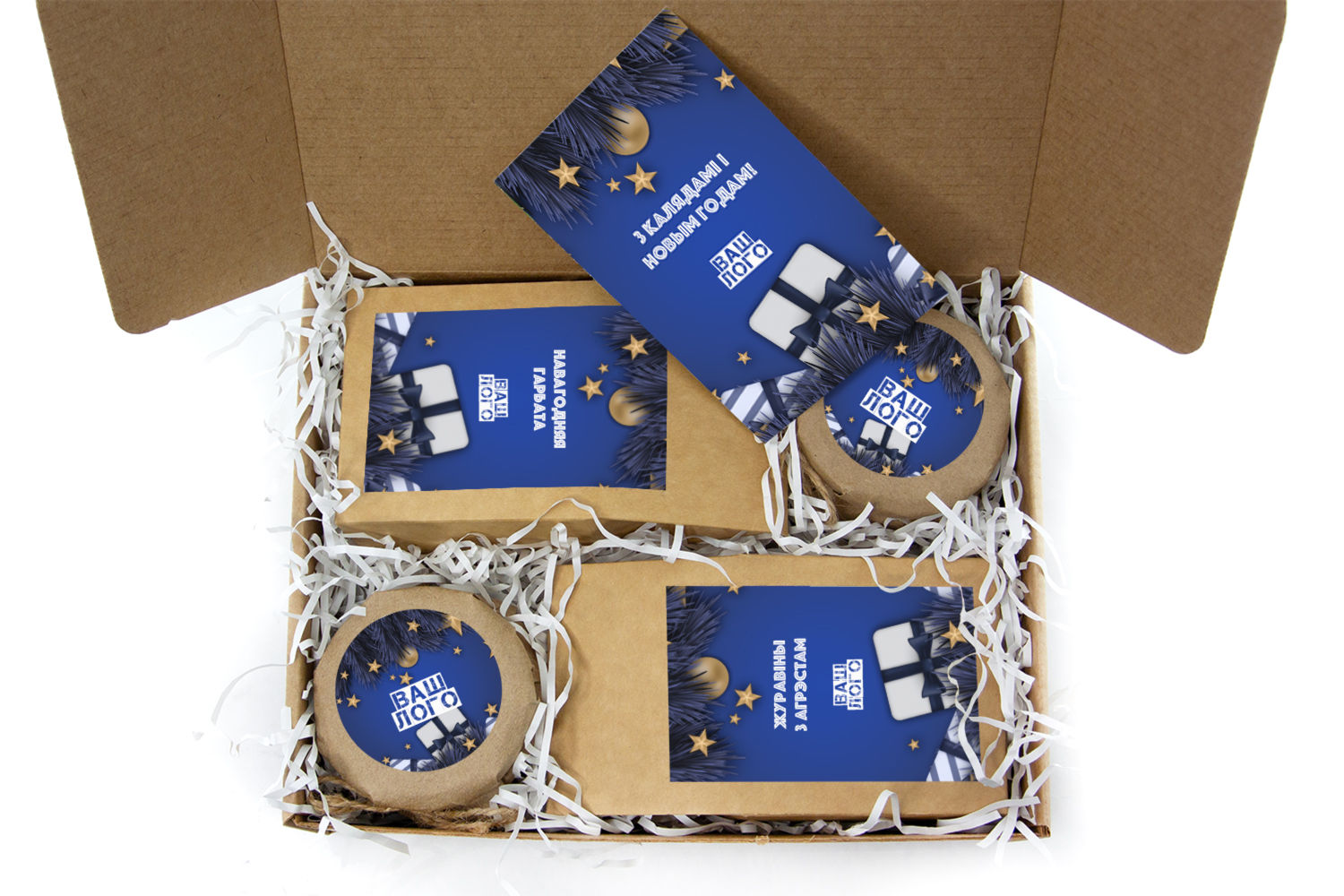 в крафт-коробке с наклейкой. Наклейка 6*9,5см с вашим логотипом