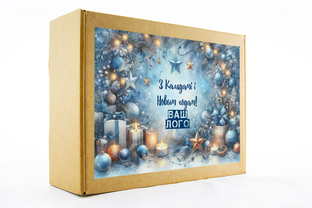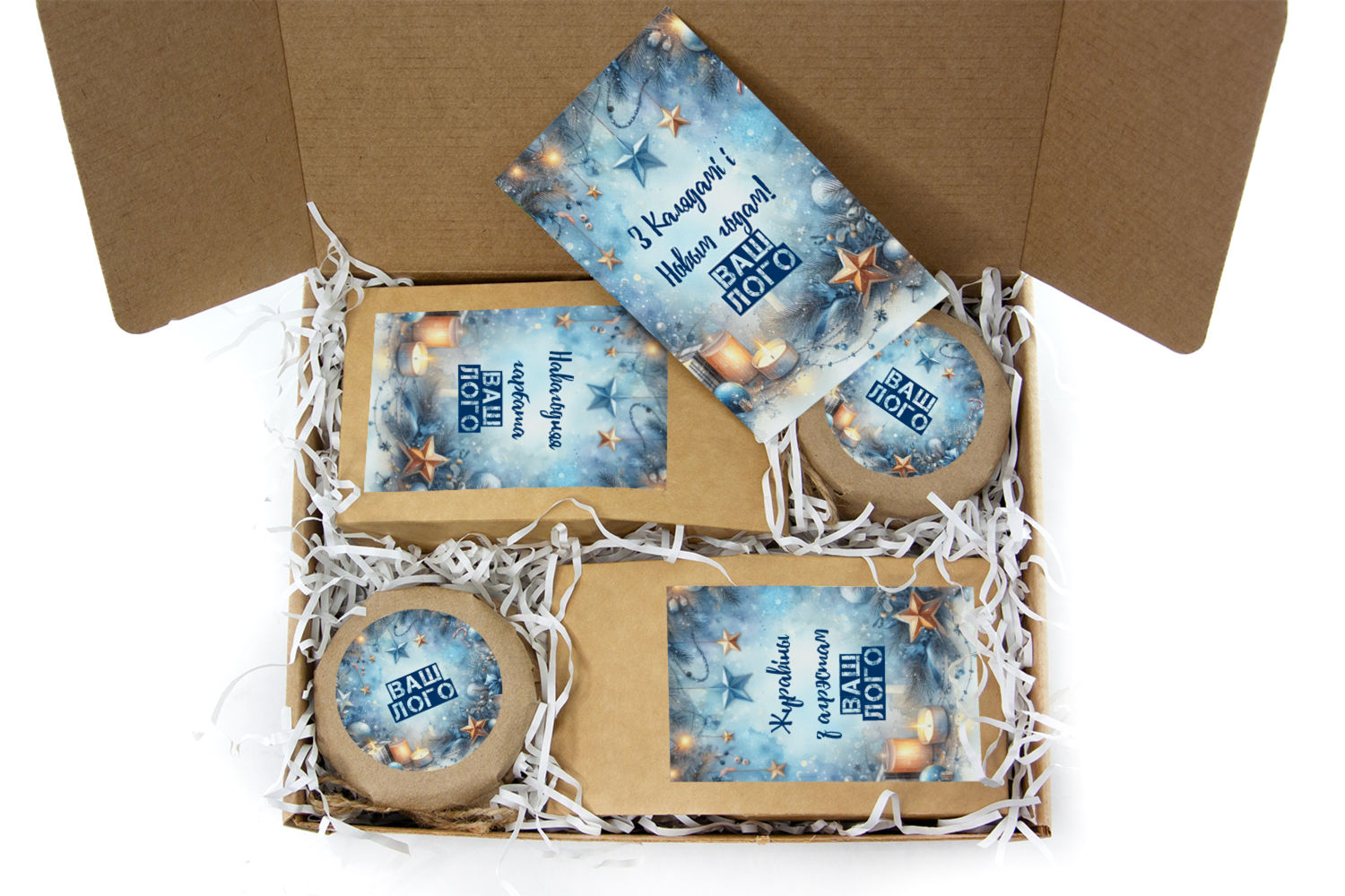 в крафт-коробке с наклейкой. Наклейка 6*9,5см с вашим логотипом