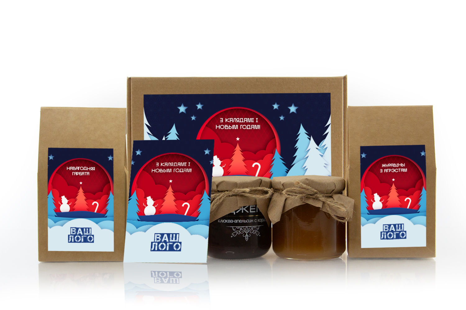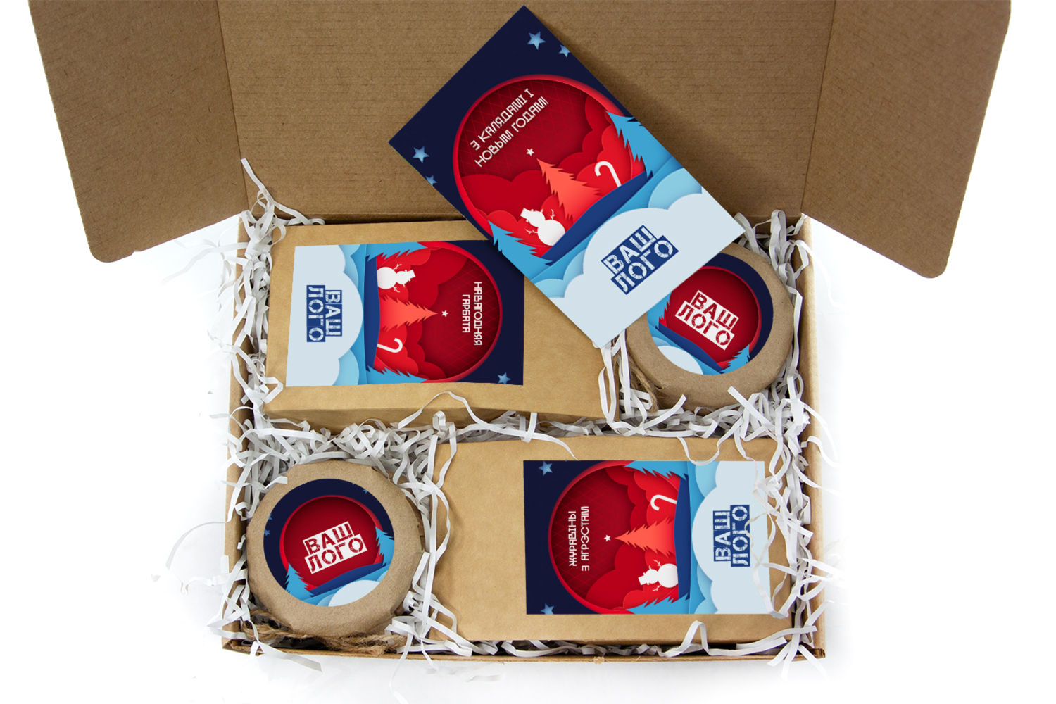 в крафт-коробке с наклейкой. Наклейка 6*9,5см с вашим логотипом