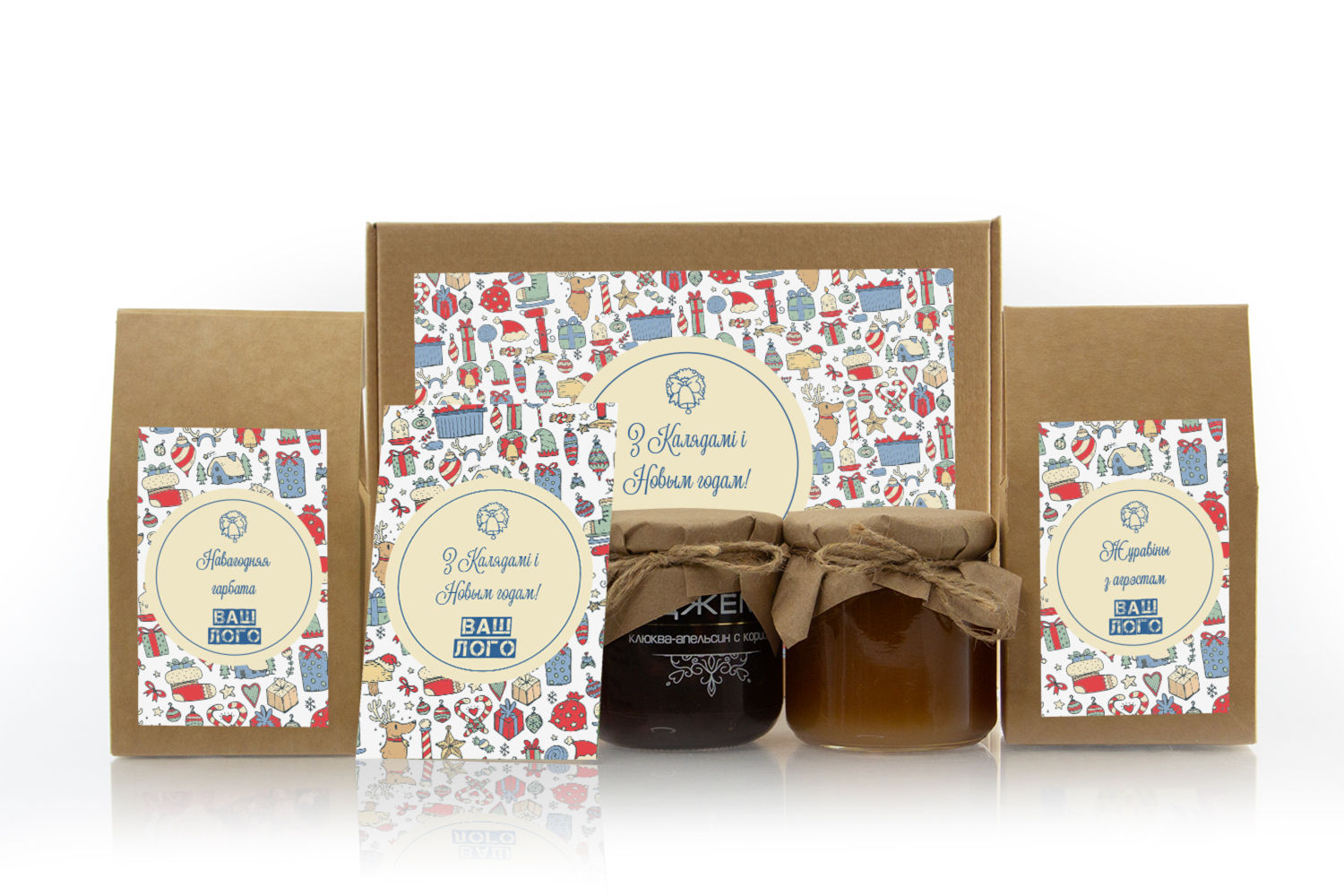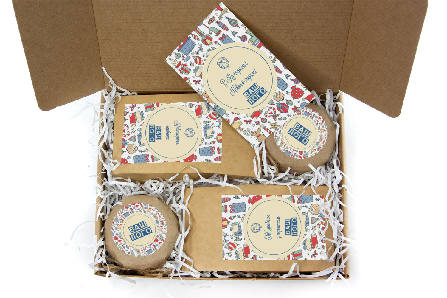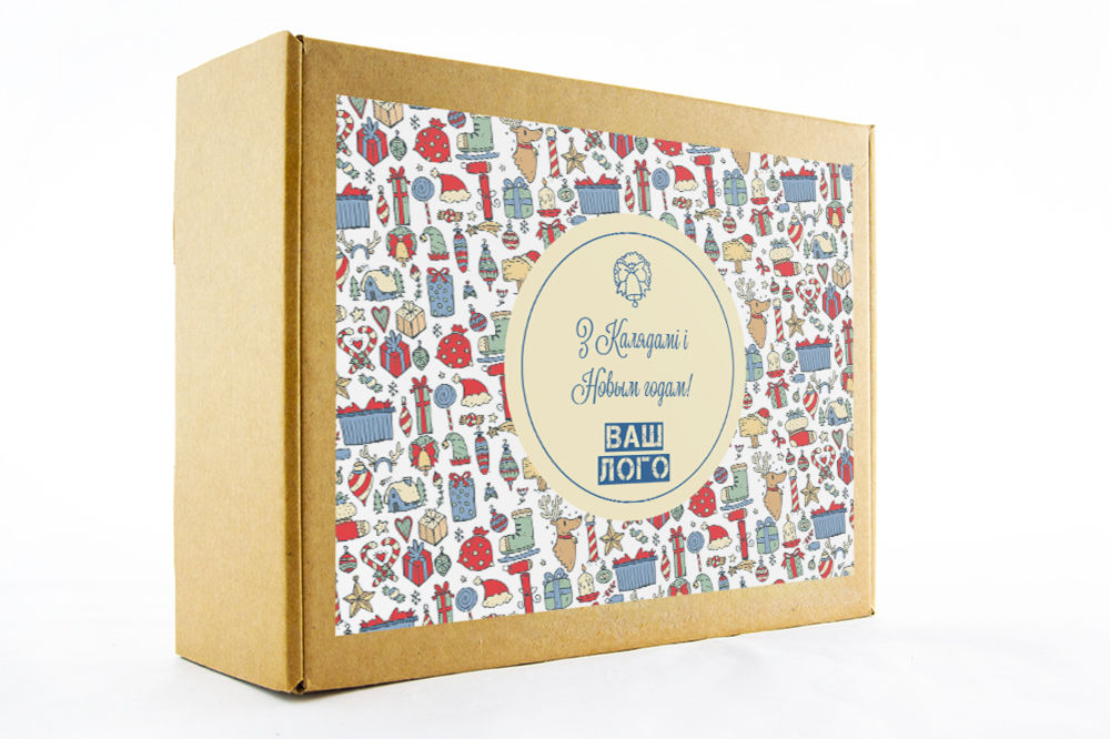 в крафт-коробке с наклейкой. Наклейка 6*9,5см с вашим логотипом
