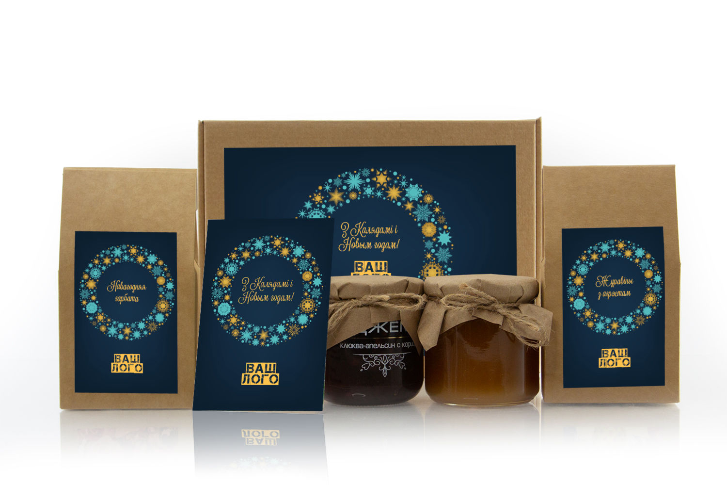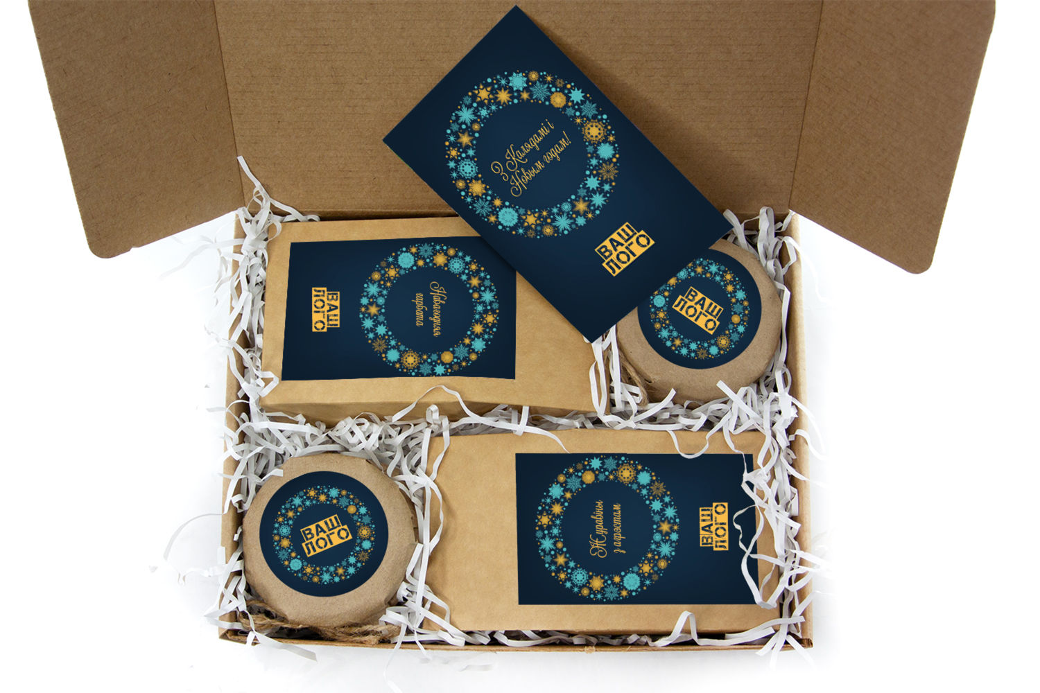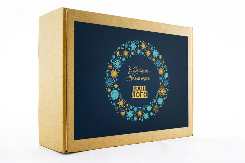 в крафт-коробке с наклейкой. Наклейка 6*9,5см с вашим логотипом