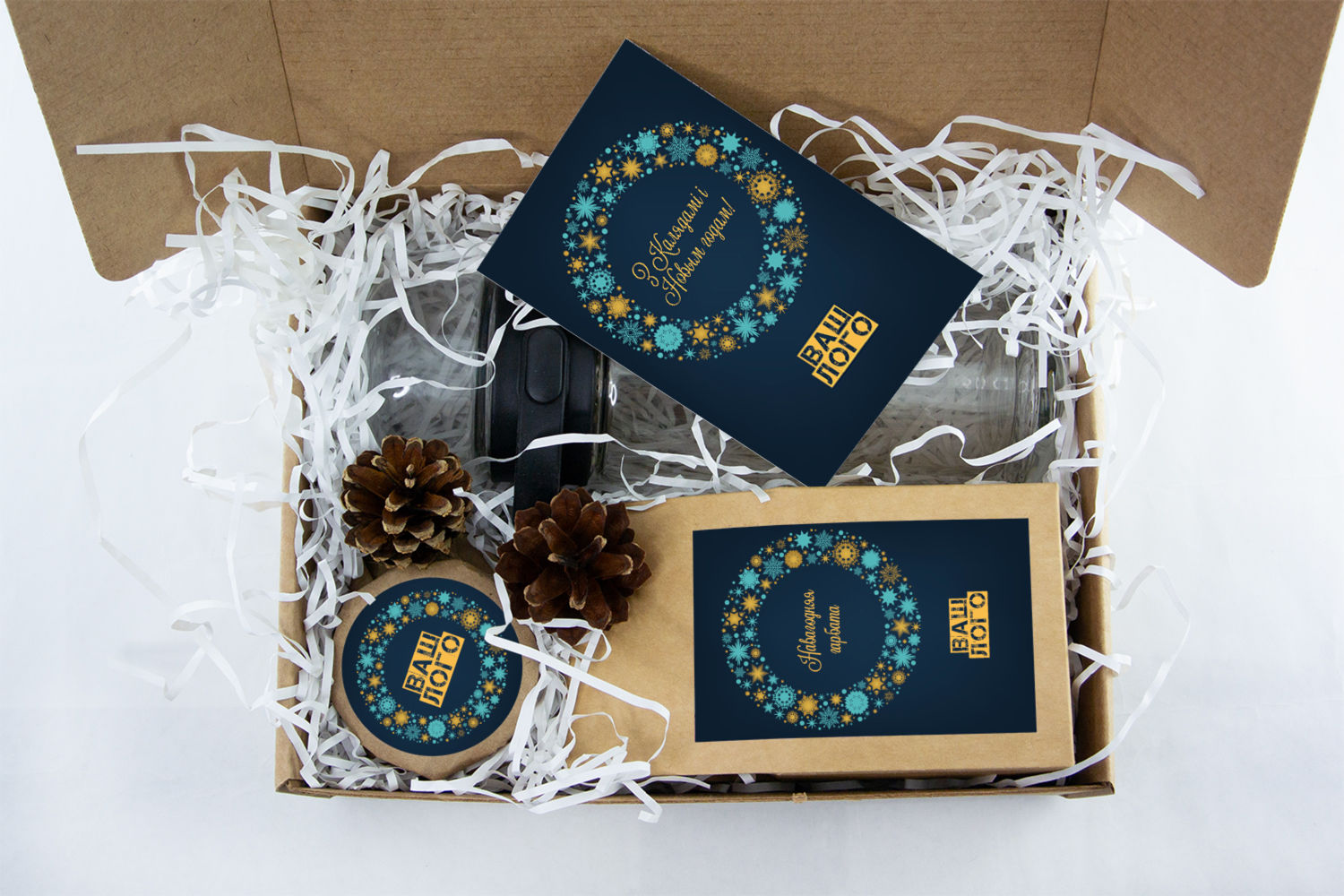 Все эти замечательные предметы будут уложены в элегантную подарочную коробку, украшенную большой наклейкой с вашим логотипом. Коробка не только защищает содержимое, но и создает эффект предвкушения, превращая момент открытия в настоящее событие.