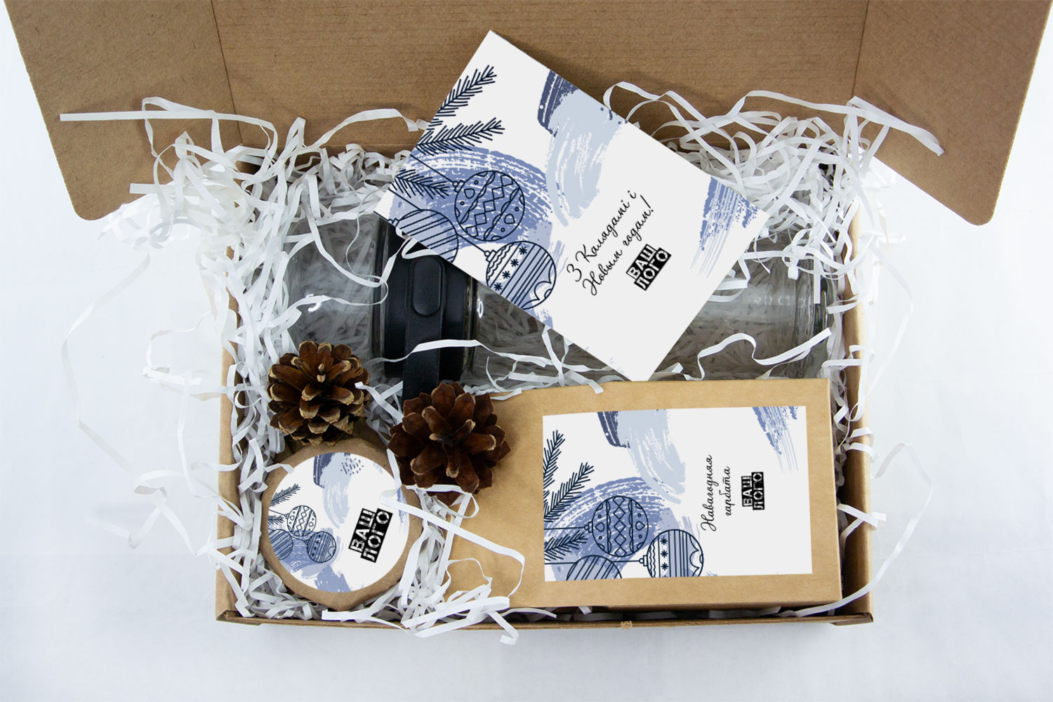в крафт-коробке с наклейкой. Наклейка 6*9,5см с вашим логотипом