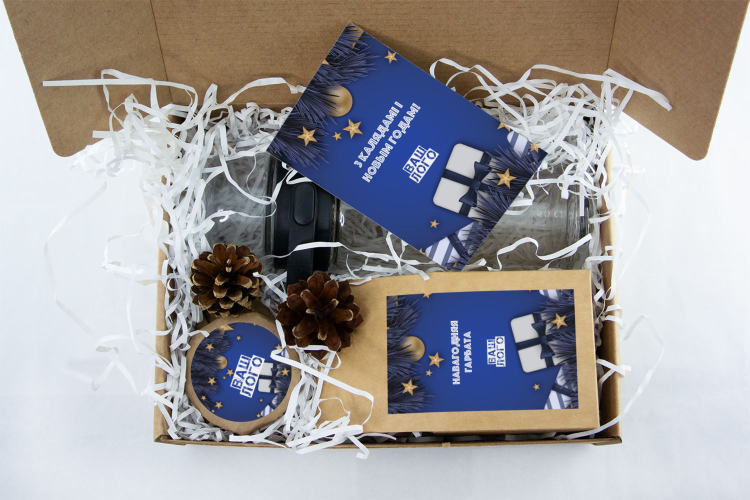 Все эти замечательные предметы будут уложены в элегантную подарочную коробку, украшенную большой наклейкой с вашим логотипом. Коробка не только защищает содержимое, но и создает эффект предвкушения, превращая момент открытия в настоящее событие.
