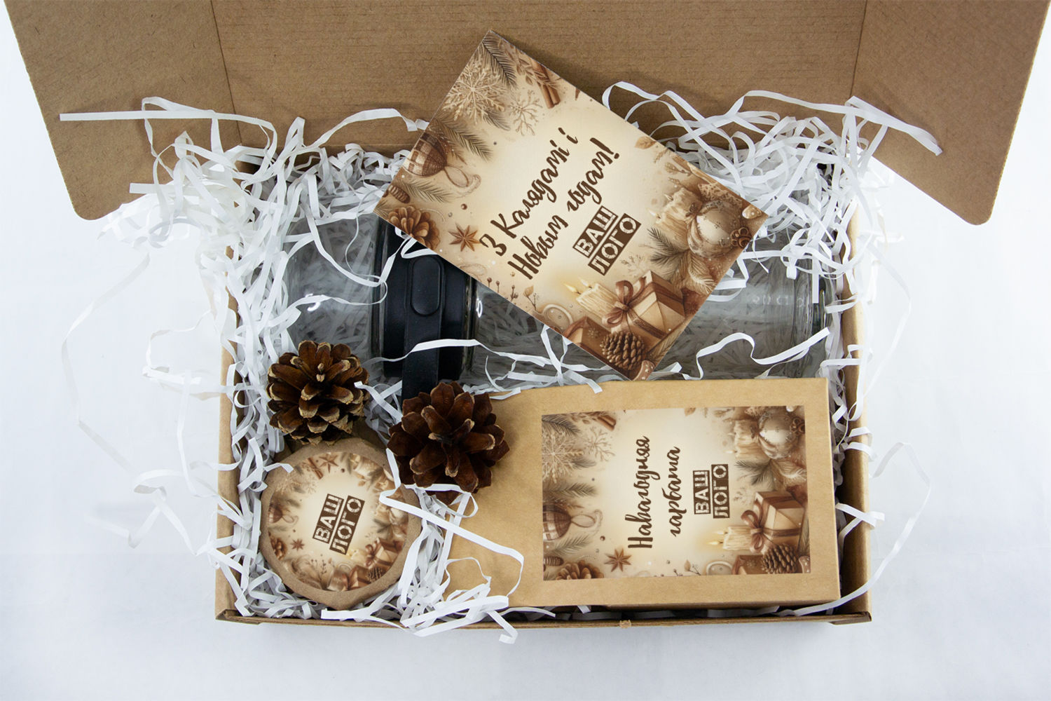 в крафт-коробке с наклейкой. Наклейка 6*9,5см с вашим логотипом