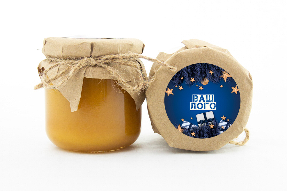 Баночка обвязана крафт-бумагой. Сверху наклейка 5 см с вашим логотипом
