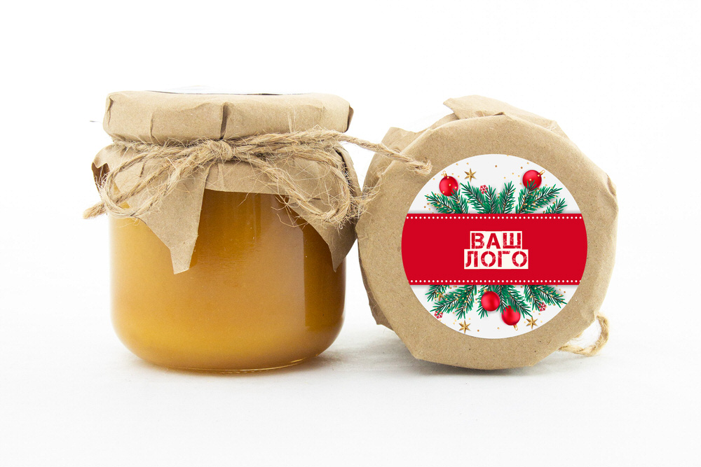 Баночка обвязана крафт-бумагой. Сверху наклейка 5 см с вашим логотипом