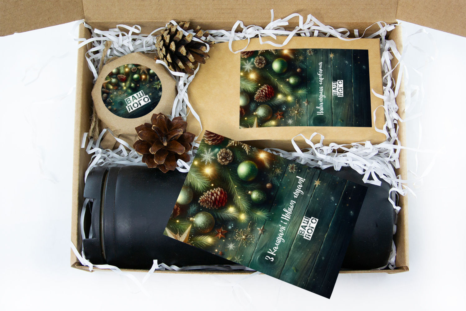 Все комплектующие мы изготовим с вашим логотипом в дизайне наклеек. Текст открытки может быть изменен, включая перевод на русский или ваш текст. По умолчанию текст открытки: