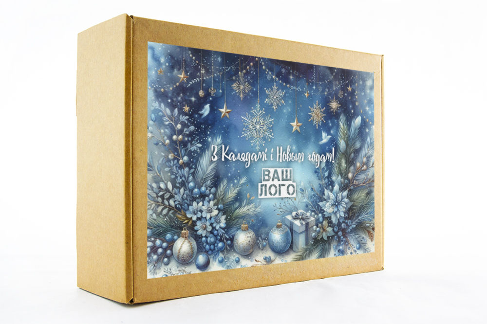 в крафт-коробке с наклейкой. Наклейка 6*9,5см с вашим логотипом