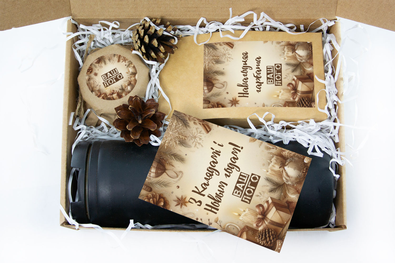 в крафт-коробке с наклейкой. Наклейка 6*9,5см с вашим логотипом