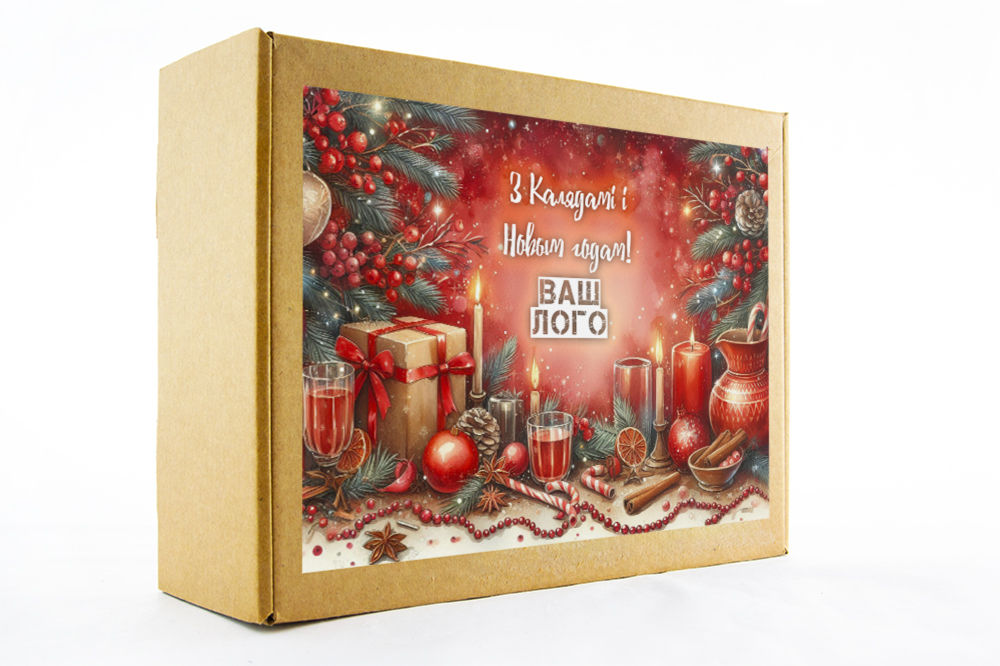 в крафт-коробке с наклейкой. Наклейка 6*9,5см с вашим логотипом
