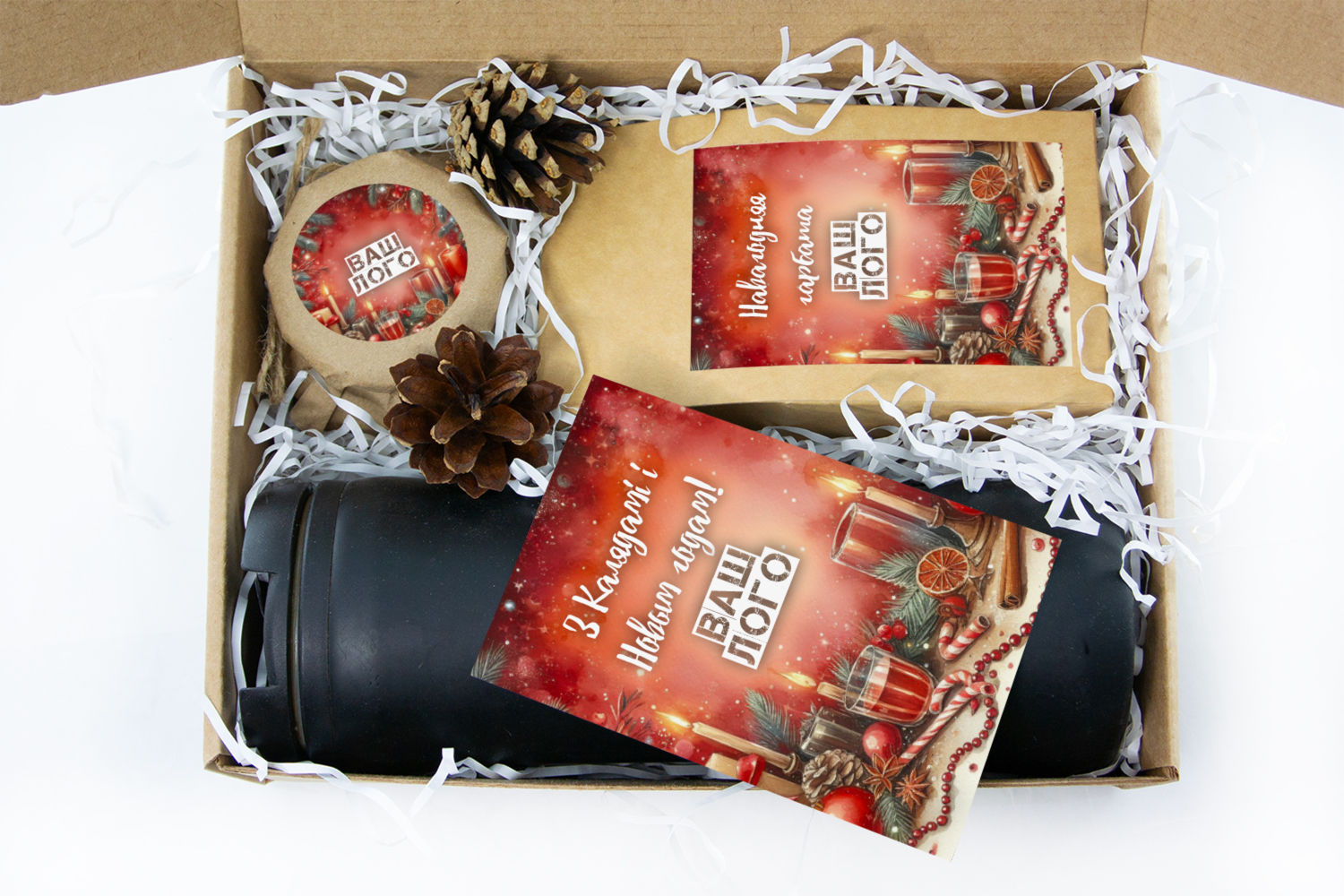 Все комплектующие мы изготовим с вашим логотипом в дизайне наклеек. Текст открытки может быть изменен, включая перевод на русский или ваш текст. По умолчанию текст открытки: