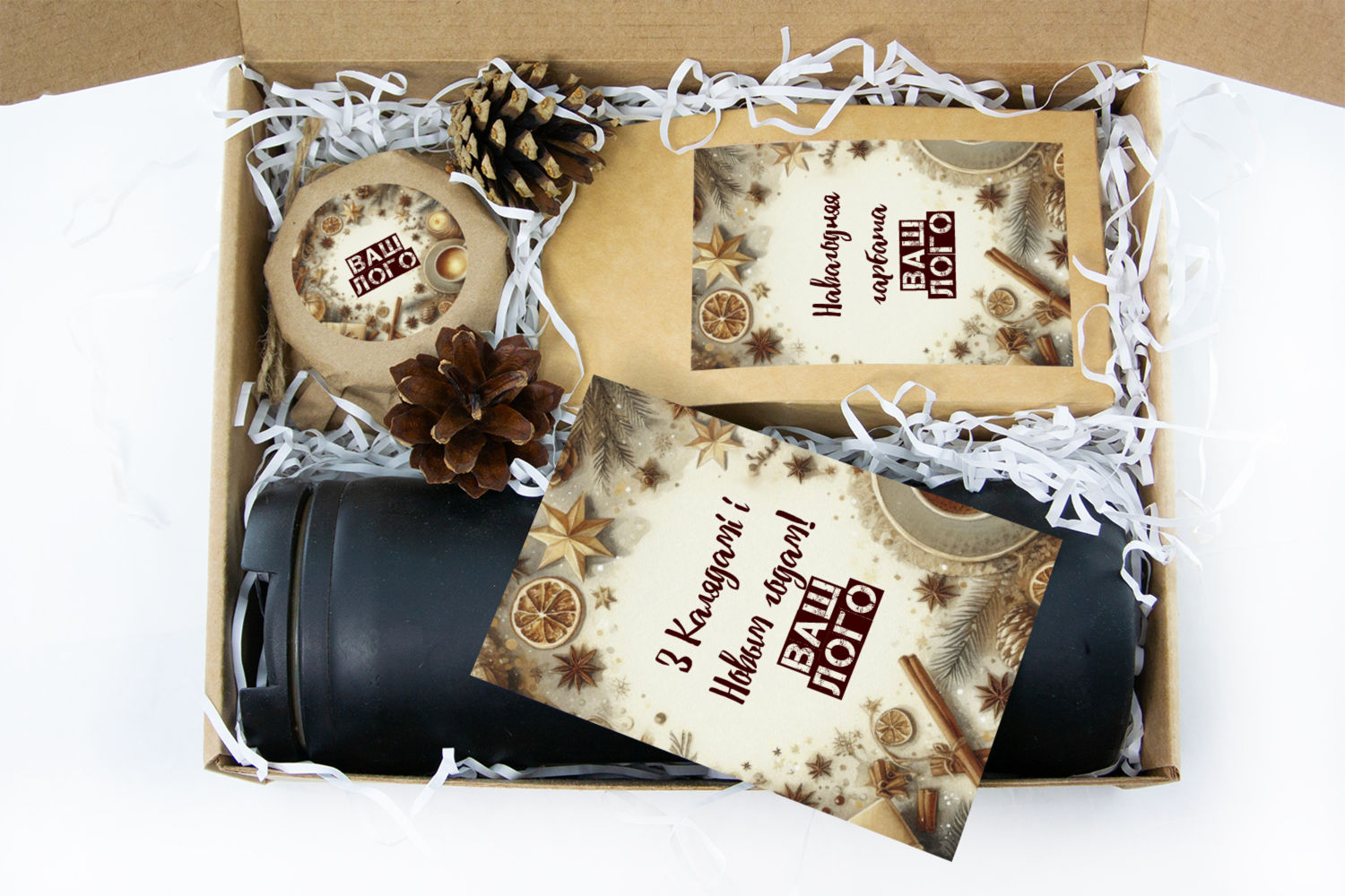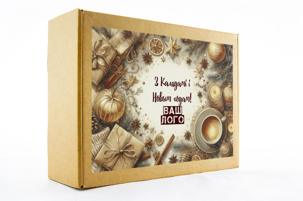в крафт-коробке с наклейкой. Наклейка 6*9,5см с вашим логотипом